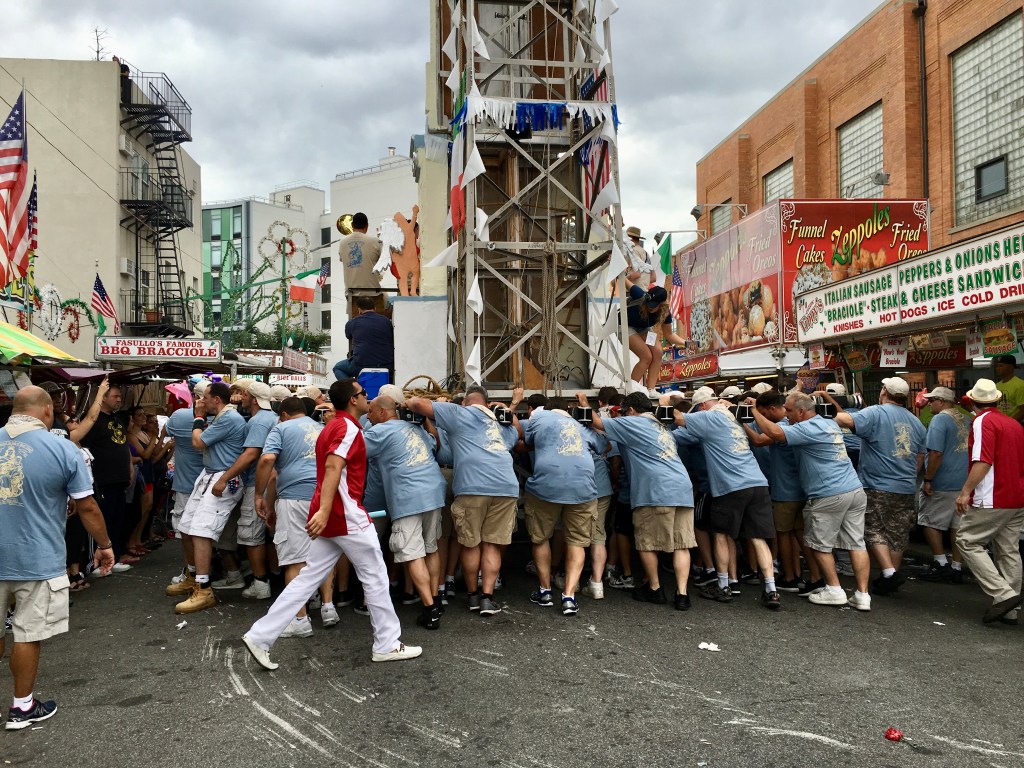Every Saturday, and sometimes on weekday evenings, a group of men in old clothes can be found in the basement of the Shrine Church of Our Lady of Mount Carmel in Williamsburg, Brooklyn. Each year the parish hosts the Feast of Our Lady of Mount Carmel and San Paolino di Nola. Its crowning event is the Dance of the Giglio, where the men lift a seventy-foot tall, four-ton tower through the streets, bearing its weight on their shoulders.