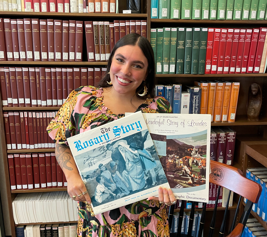 This past summer, I was fortunate to receive the inaugural Visiting Scholar Fellowship at the Marian Library to support my research for the book. The Marian Library is full of treasures — my favorite kind of treasures: the material culture of Catholic devotion. In its collection, I pored through boxes of carefully cataloged rosaries. There were electronic rosaries; rosaries designed especially for steering wheels and gear shifts; and rosaries made from surprising materials — such as peach pits and horse hair. As a scholar of material culture and embodiment, handling these objects was important. Feeling the size, temperature, texture and even smell (some scents were pleasant, others were rancid!) of the beads is essential for understanding the sensory dimensions of prayer.